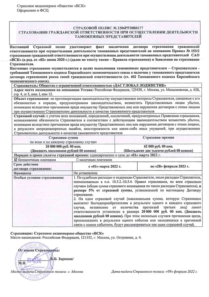 - Страховой полис (ОАО «ВСК») № 2206PF30R0177 от 01 Марта 2022 г. – страхование гражданской ответственности при осуществлении деятельности таможенных представителей.