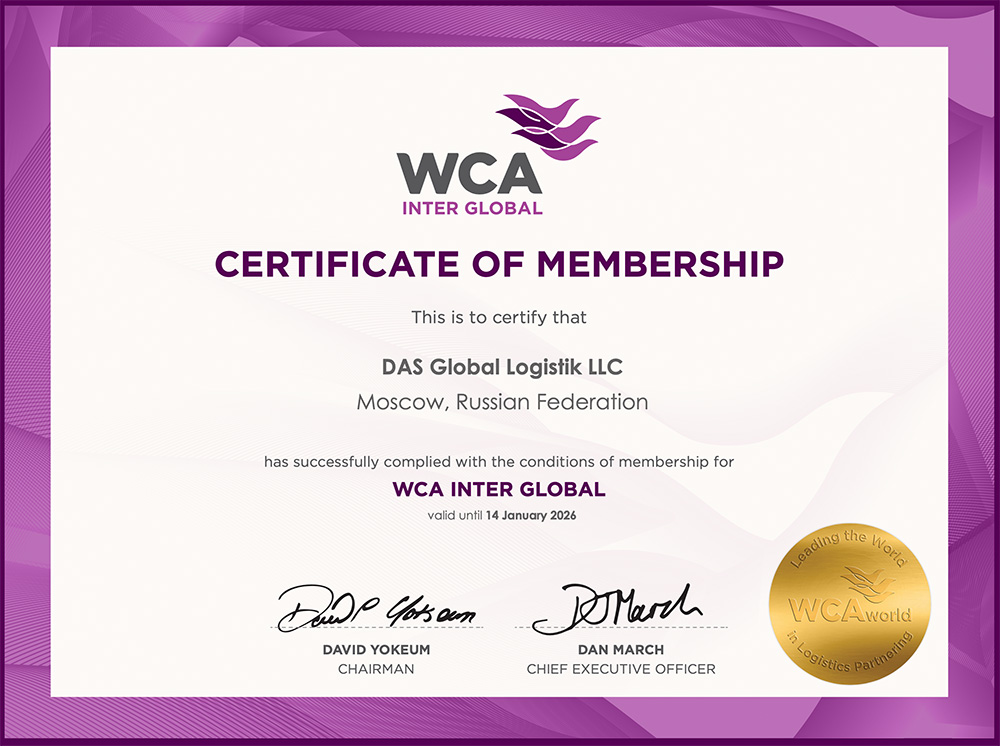 - Сертификат WCA PROJECTS, подтверждающий членство в международной ассоциации WCA PROJECTS по проектным грузам на 2026 г.